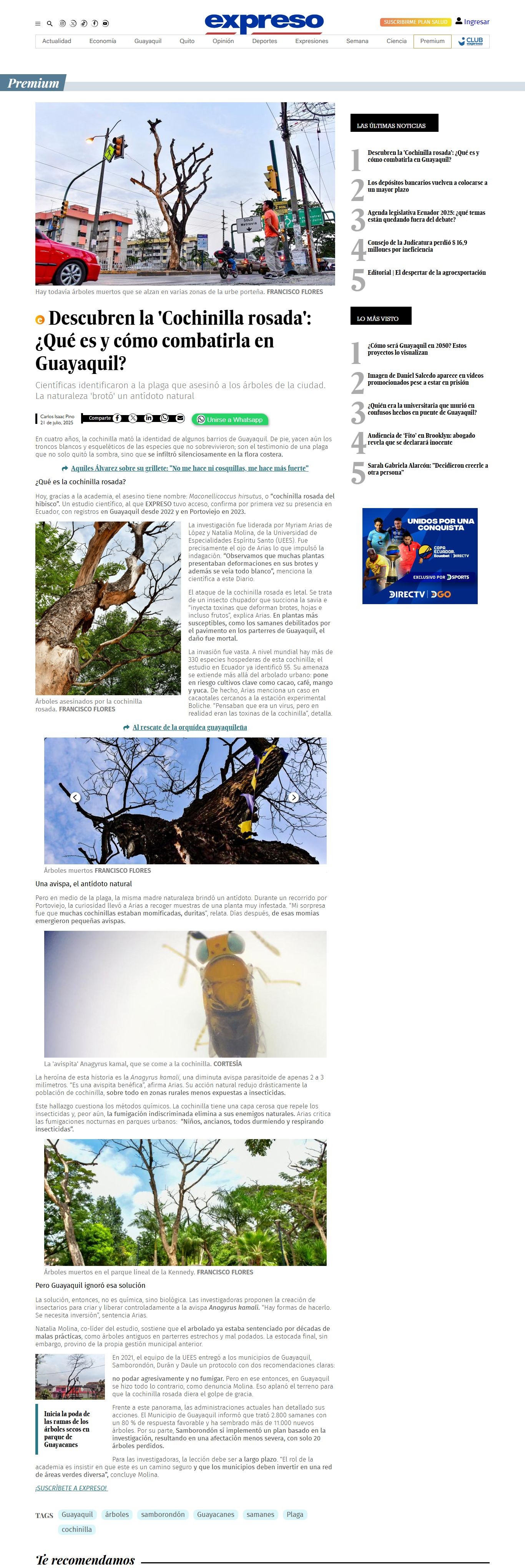 En cuatro años, la cochinilla mató la identidad de algunos barrios de Guayaquil. De pie, yacen aún los troncos blancos y esqueléticos de las especies que no sobrevivieron; son el testimonio de una plaga que no solo quitó la sombra, sino que se infiltró silenciosamente en la flora costera. Hoy, gracias a la academia, el asesino tiene nombre: Maconellicoccus hirsutus, o "cochinilla rosada del hibisco". Un estudio científico, al que EXPRESO tuvo acceso, confirma por primera vez su presencia en Ecuador, con registros en Guayaquil desde 2022 y en Portoviejo en 2023. La investigación fue liderada por Myriam Arias de López y Natalia Molina, de la Universidad de Especialidades Espíritu Santo (UEES). Fue precisamente el ojo de Arias lo que impulsó la indagación. "Observamos que muchas plantas presentaban deformaciones en sus brotes y además se veía todo blanco", menciona la científica a este Diario. El ataque de la cochinilla rosada es letal. Se trata de un insecto chupador que succiona la savia e "inyecta toxinas que deforman brotes, hojas e incluso frutos", explica Arias. En plantas más susceptibles, como los samanes debilitados por el pavimento en los parterres de Guayaquil, el daño fue mortal. La invasión fue vasta. A nivel mundial hay más de 330 especies hospederas de esta cochinilla; el estudio en Ecuador ya identificó 55. Su amenaza se extiende más allá del arbolado urbano: pone en riesgo cultivos clave como cacao, café, mango y yuca. De hecho, Arias menciona un caso en cacaotales cercanos a la estación experimental Boliche. "Pensaban que era un virus, pero en realidad eran las toxinas de la cochinilla", detalla. Pero en medio de la plaga, la misma madre naturaleza brindó un antídoto. Durante un recorrido por Portoviejo, la curiosidad llevó a Arias a recoger muestras de una planta muy infestada. "Mi sorpresa fue que muchas cochinillas estaban momificadas, duritas", relata. Días después, de esas momias emergieron pequeñas avispas. La heroína de esta historia es la Anagyrus kamali, una diminuta avispa parasitoide de apenas 2 a 3 milímetros. "Es una avispita benéfica", afirma Arias. Su acción natural redujo drásticamente la población de cochinilla, sobre todo en zonas rurales menos expuestas a insecticidas. Este hallazgo cuestiona los métodos químicos. La cochinilla tiene una capa cerosa que repele los insecticidas y, peor aún, la fumigación indiscriminada elimina a sus enemigos naturales. Arias critica las fumigaciones nocturnas en parques urbanos: "Niños, ancianos, todos durmiendo y respirando insecticidas". La solución, entonces, no es química, sino biológica. Las investigadoras proponen la creación de insectarios para criar y liberar controladamente a la avispa Anagyrus kamali. "Hay formas de hacerlo. Se necesita inversión", sentencia Arias. Natalia Molina, co-líder del estudio, sostiene que el arbolado ya estaba sentenciado por décadas de malas prácticas, como árboles antiguos en parterres estrechos y mal podados. La estocada final, sin embargo, provino de la propia gestión municipal anterior. En 2021, el equipo de la UEES entregó a los municipios de Guayaquil, Samborondón, Durán y Daule un protocolo con dos recomendaciones claras: no podar agresivamente y no fumigar. Pero en ese entonces, en Guayaquil se hizo todo lo contrario, como denuncia Molina. Eso aplanó el terreno para que la cochinilla rosada diera el golpe de gracia. Frente a este panorama, las administraciones actuales han detallado sus acciones. El Municipio de Guayaquil informó que trató 2.800 samanes con un 80 % de respuesta favorable y ha sembrado más de 11.000 nuevos árboles. Por su parte, Samborondón sí implementó un plan basado en la investigación, resultando en una afectación menos severa, con solo 20 árboles perdidos. Para las investigadoras, la lección debe ser a largo plazo. "El rol de la academia es insistir en que este es un camino seguro y que los municipios deben invertir en una red de áreas verdes diversa", concluye Molina. ¡SUSCRÍBETE A EXPRESO!