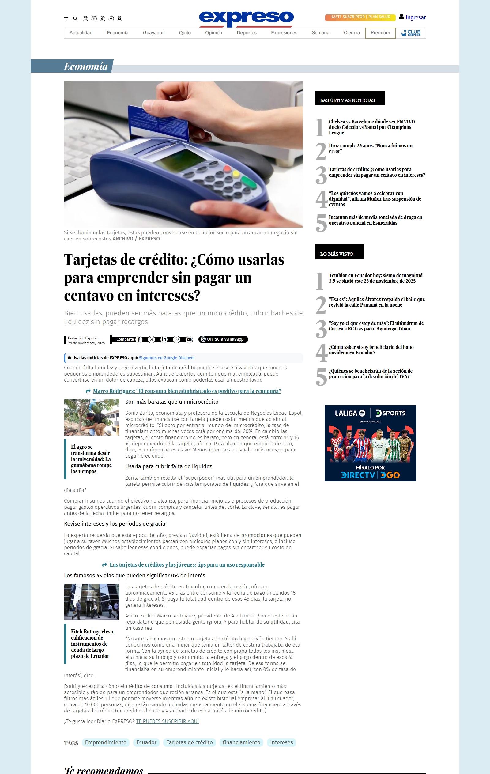 Cuando falta liquidez y urge invertir, la tarjeta de crédito puede ser ese 'salvavidas' que muchos pequeños emprendedores subestiman. Aunque expertos admiten que mal empleada, puede convertirse en un dolor de cabeza, ellos explican cómo poderlas usar a nuestro favor. El agro se transforma desde la universidad: La guanábana rompe los tiempos Sonia Zurita, economista y profesora de la Escuela de Negocios Espae-Espol, explica que financiarse con tarjeta puede costar menos que acudir al microcrédito. Si opto por entrar al mundo del microcrédito, la tasa de financiamiento muchas veces está por encima del 20%. En cambio las tarjetas, el costo financiero no es barato, pero en general está entre 14 y 16 %, dependiendo de la tarjeta, afirma. Para alguien que empieza de cero, dice, esa diferencia es clave. Menos intereses es igual a más margen para seguir creciendo. Zurita también resalta el superpoder más útil para un emprendedor: la tarjeta permite cubrir déficits temporales de liquidez. ¿Para qué sirve en el día a día? Comprar insumos cuando el efectivo no alcanza, para financiar mejoras o procesos de producción, pagar gastos operativos urgentes, cubrir compras y cancelar antes del corte. La clave, señala, es pagar antes de la fecha límite, para no tener recargos. La experta recuerda que esta época del año, previa a Navidad, está llena de promociones que pueden jugar a su favor. Muchos establecimientos pactan con emisores planes con y sin intereses, e incluso periodos de gracia. Si sabe leer esas condiciones, puede espaciar pagos sin encarecer su costo de capital. Fitch Ratings eleva calificación de instrumentos de deuda de largo plazo de Ecuador Las tarjetas de crédito en Ecuador, como en la región, ofrecen aproximadamente 45 días entre consumo y la fecha de pago (incluidos 15 días de gracia). Si paga la totalidad dentro de esos 45 días, la tarjeta no genera intereses. Así lo explica Marco Rodríguez, presidente de Asobanca. Para él este es un recordatorio que demasiada gente ignora. Y para hablar de su utilidad, cita un caso real: Nosotros hicimos un estudio tarjetas de crédito hace algún tiempo. Y allí conocimos cómo una mujer que tenía un taller de costura trabajaba de esa forma. Con la ayuda de tarjetas de crédito compraba todos los insumos... ella hacía su trabajo y coordinaba la entrega y el pago dentro de esos 45 días, lo que le permitía pagar en totalidad la tarjeta. De esa forma se financiaba en su emprendimiento inicial y lo hacía así, con 0% de tasa de interés, dice. Rodríguez explica cómo el crédito de consumo -incluidas las tarjetas- es el financiamiento más accesible y rápido para un emprendedor que recién arranca. Es el que está a la mano. El que pasa filtros más ágiles. El que permite moverse mientras aún no existe historial empresarial. En Ecuador, cerca de 10.000 personas, dijo, están siendo incluidas mensualmente en el sistema financiero a través de tarjetas de crédito (de créditos directo y gran parte de eso a través de microcrédito). ¿Te gusta leer Diario EXPRESO? TE PUEDES SUSCRIBIR AQUÍ